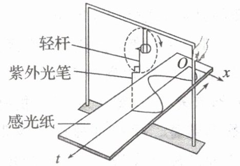 8.(2024·河北卷·6)如图,一电动机带动轻杆在竖直框架平面内匀速转动,轻杆一端固定在电动机的转轴上,另一端悬挂一紫外光笔,转动时紫外光始终竖直投射至水平铺开的感光纸上,沿垂直于框架的方向匀速拖动感光纸,感光纸上就画出了描述光点振动的$x-t$图像。已知轻杆在竖直面内长0.1m,电动机转速为12r/min,该振动的圆频率和光点在12.5s内通过的路程分别为