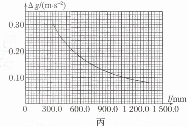 $ m/s^2 $(保留3位有效数字)。(3) (6分) 改变摆线长度 $ l $,记录并分析单摆的振动视频,得到相应的振动周期。他们发现,分别用 $ l $ 和 $ l + \frac{d}{2} $ 作为摆长,这两种计算方法得到的重力加速度数值的差异大小 $ \Delta g $ 随摆线长度 $ l $ 的变化曲线如图丙所示。由图可知,该实验中,随着摆线长度 $ l $ 的增加,$ \Delta g $ 的变化特点是 ________,原因是 ________。