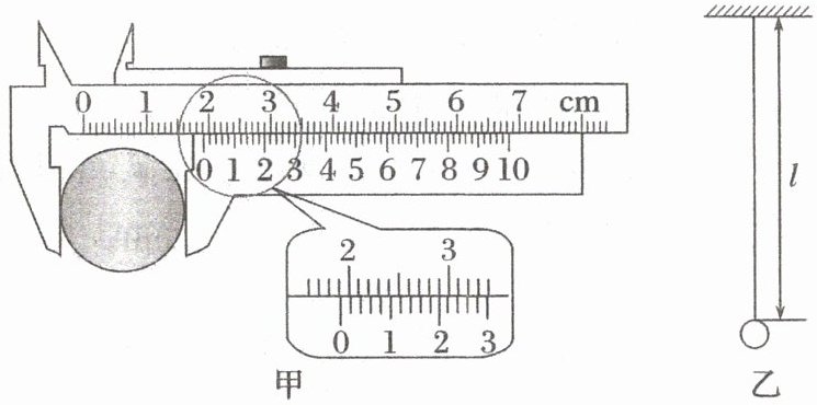 (1) (2分) 用游标卡尺测量摆球直径 $ d $。当测量爪并拢时,游标尺和主尺的零刻度线对齐。放置摆球后游标卡尺示数如图甲所示,则摆球的直径 $ d $ 为