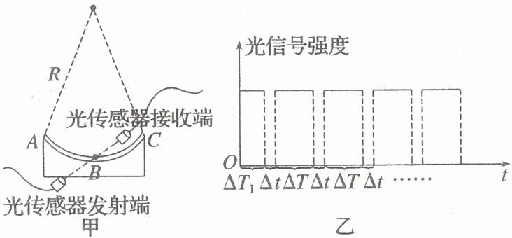 一同学利用图甲所示装置来测定当地的重力加速度。已知光滑圆弧凹槽 $ ABC $ 的半径为 $ R $,弧长为 $ l $($ R $ 远大于 $ l $),$ B $ 为圆弧轨道最低点,$ A $、$ C $ 关于 $ B $ 点所在的竖直线对称。小钢球的半径为 $ r $($ r $ 远小于 $ l $),当小钢球经过圆弧轨道最低点 $ B $ 时,光传感器发出的光所在直线,恰好能过小钢球的球心。现将小钢球从 $ A $ 点由静止释放,沿凹槽 $ ABC $ 自由往复运动,光传感器接收端接收到一段时间内的光信号强度变化情况如图乙所示(只有 $ \Delta T $ 已知)。