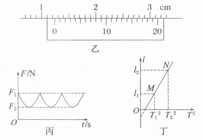 。(3) (6分) 若在某次实验时该同学未测量摆球直径 $ d $,在测得多组细线长度 $ l $ 和对应的周期 $ T $ 后,画出 $ l - T^2 $ 图像。在图线上选取 $ M $、$ N $ 两个点,找到两点相应的横、纵坐标。如图丁所示,利用该两点的坐标可得重力加速度表达式 $ g = $