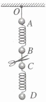 @@g 0 解析 假设C、D间细线拉力大小为T,剪断B、C间细线瞬间,两球运动状态相同,对C:$2mg+T=2ma$ ①对D:$mg-T=ma$ ②联立①②可得:$a=g$,$T=0$。