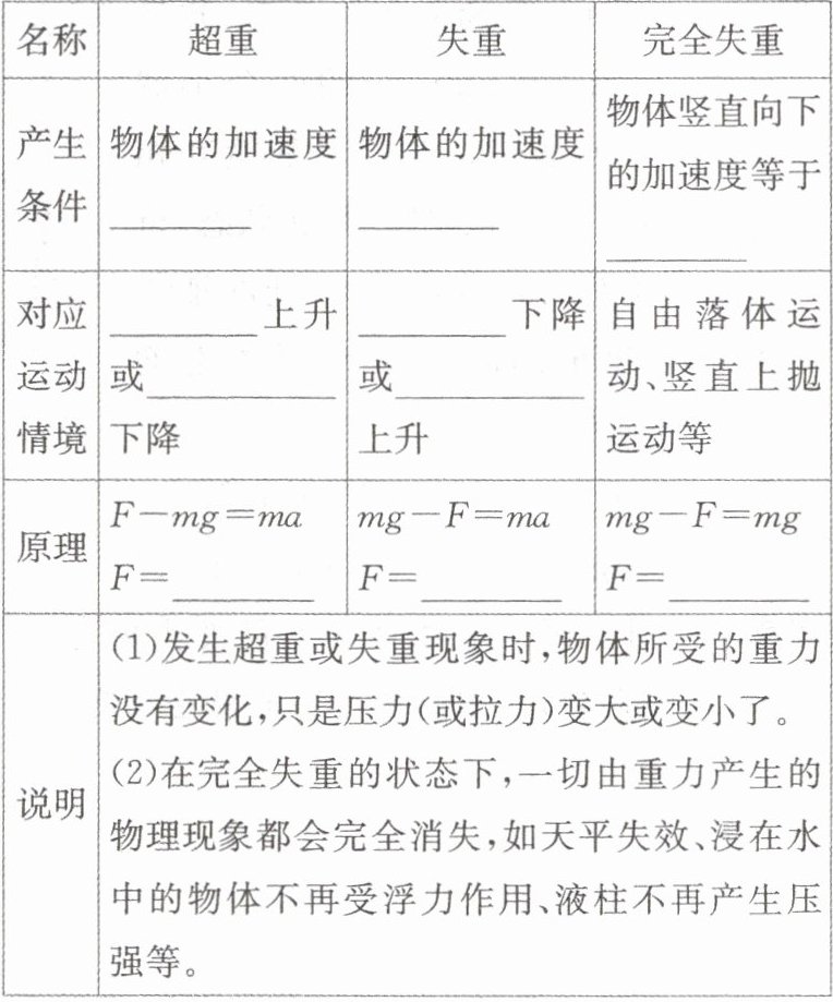 竖直向上;竖直向下;重力加速度$g$;加速;减速;加速;减速;$m(g + a)$;$m(g - a)$;$0$