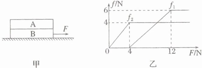 (2025·河南信阳市第一高级中学月考)如图甲所示,物块A、B静止叠放在水平地面上,B受到从零开始逐渐增大的水平拉力$F$的作用,A、B间的摩擦力$f_1$、B与地面间的摩擦力$f_2$随水平拉力$F$变化的情况如图乙所示。已知物块A的质量$m = 3\ kg$,$g$取$10\ m/s^2$,设最大静摩擦力等于滑动摩擦力。