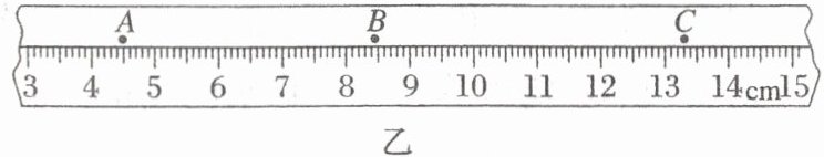 (4) 实验中打出的一条纸带的一部分如图乙所示。纸带上标出了连续的3个计数点$A$、$B$、$C$,相邻计数点之间还有4个点没有标出。打点计时器接在频率为$50Hz$的交流电源上。则打点计时器打$B$点时,小车的速度$v_{B}=$