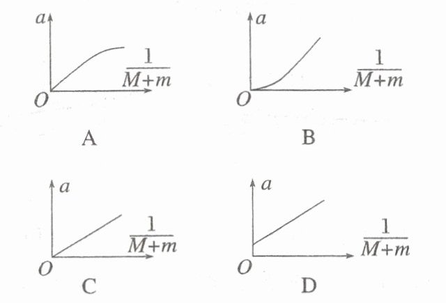 (7) 在探究加速度与质量的关系时,要保证沙和沙桶的质量不变。若沙和沙桶的质量$m$与小车的总质量$M$间的关系不满足第(3)问中的条件,且已正确平衡阻力,由实验数据作出$a-\frac{1}{M + m}$图线,则图线应如图中的