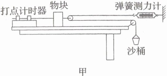 (2024·山东潍坊市模拟)如图甲所示,某实验小组利用验证牛顿第二定律的实验装置测定物块与木板之间的动摩擦因数,实验装置正确安装后,调节木板及物块右侧两段细绳水平。实验开始时在沙桶中放入适量的细沙,物块做加速运动,打出的纸带如图乙所示,已知所用交流电源的频率为$50Hz$,重力加速度大小为$g$。
