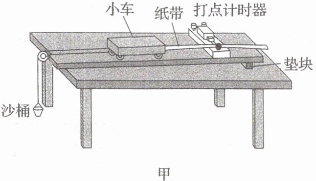 (2) 实验前平衡阻力的做法是:把实验器材安装好,先不挂沙桶,将小车放在木板上,后面固定一条纸带,纸带穿过打点计时器。用垫块把木板不带滑轮一端垫高,接通打点计时器,让小车以一定初速度沿木板向下运动,并不断调节木板的倾斜度,直到小车拖动纸带沿木板做