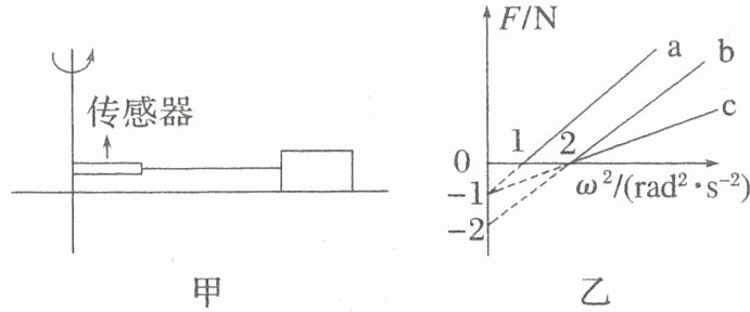 (3)由题图乙知a的纵截距$-\mu_{a}m_{a}g = - 1\ N$,b的纵截距$-\mu_{b}m_{b}g = - 2\ N$,c的纵截距$-\mu_{c}m_{c}g = - 1\ N$,结合质量之比得到物块a、b、c与转盘之间的动摩擦因数之比为1:2:2。