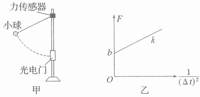 (2)多次拉起小球,每次拉起小球时细线与竖直方向的夹角不同,每次都记录小球通过光电门的时间$\Delta t$,作出细线拉力$F$与$\frac{1}{(\Delta t)^2}$的关系图线如图乙所示,已知图像的斜率为$k$,截距为$b$,则小球的质量为$\underline{\underline{~~~~~~~~~~}}$,当地的重力加速度为$\underline{\underline{~~~~~~~~~~}}$(用题中给出的字母表示)。