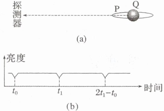 (2023·广东卷·7)如图(a)所示,太阳系外的一颗行星 $ P $ 绕恒星 $ Q $ 做匀速圆周运动。由于 $ P $ 的遮挡,探测器探测到 $ Q $ 的亮度随时间做如图(b)所示的周期性变化,该周期与 $ P $ 的公转周期相同。已知 $ Q $ 的质量为 $ M $,引力常量为 $ G $。关于 $ P $ 的公转,下列说法正确的是(