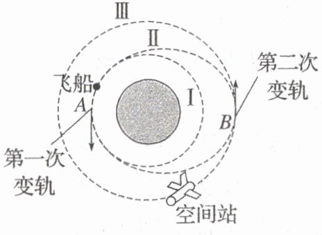 (2024·浙江杭州市期中)2022年11月,“天舟五号”货运飞船仅用2小时就与“天宫”空间站快速交会对接。飞船从预定轨道Ⅰ的 $ A $ 点第一次变轨进入椭圆轨道Ⅱ,到达椭圆轨道的远地点 $ B $ 时,再次变轨进入空间站的运行轨道Ⅲ,与空间站实现对接,假设轨道Ⅰ和Ⅲ都近似为圆轨道,不计飞船质量的变化,则飞船(