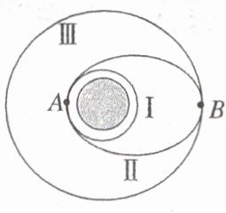 (3) 周期:设卫星在Ⅰ、Ⅱ、Ⅲ轨道上运行周期分别为 $ T_{1} $、$ T_{2} $、$ T_{3} $,轨道半径为 $ r_{1} $、$ r_{2} $(半长轴)、$ r_{3} $。由开普勒第三定律 $ \frac{r^{3}}{T^{2}} = k $,可知有 $ T_{1} $$ T_{2} < T_{3} $。