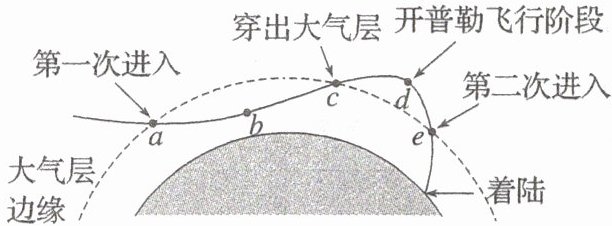 2024年6月25日,嫦娥六号返回器准确着陆于预定区域,实现世界首次月球背面采样返回。嫦娥六号返回器从月球归来初入大气层时的速度可以接近第二宇宙速度,为避免高速带来的高温过载风险,采用了“半弹道跳跃式返回”减速技术。如图所示,返回器从 $ a $ 点第一次进入大气层,调整返回器姿态,使其经 $ b $ 点升高,再从 $ c $ 点“跳”出大气层,在太空中潇洒地打个“水漂”,升高到距地面高度为 $ h $ 的 $ d $ 点后,再次从 $ e $ 点进入大气层返回地球。假设返回器从 $ c $ 点到 $ e $ 点的过程为无动力飞行。已知地球表面重力加速度为 $ g $,地球的半径为 $ R $,引力常量为 $ G $。结合以上信息,下列说法正确的是(