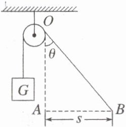 解析 拖车对绳子做的功等于绳子对物体做的功,以物体为研究对象,由于整个过程中物体匀速运动,所以绳子的拉力大小$T = G$。物体上升的距离等于滑轮右侧后来的绳长$OB$减去开始时的绳长$OA$,即$l = \frac{s}{\sin\theta} - \frac{s}{\tan\theta}$,所以绳子对物体做的功$W = Tl = \frac{1 - \cos\theta}{\sin\theta}G_{s}$,则拖车对绳子做的功等于$\frac{1 - \cos\theta}{\sin\theta}G_{s}$。