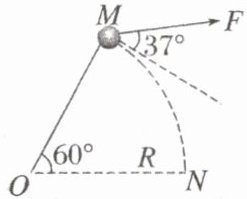 1. (2025·山东烟台市龙口市段考)水平桌面上,长$6\mathrm{m}$的轻绳一端固定于$O$点,如图所示(俯视图),另一端系一质量$m = 2.0\mathrm{kg}$的小球。现对小球施加一个沿桌面大小不变的力$F = 10\mathrm{N}$,$F$拉着小球从$M$点运动到$N$点,$F$的方向始终与小球的运动方向成$37^{\circ}$角。已知小球与桌面间的动摩擦因数$\mu = 0.2$,不计空气阻力,$g$取$10\mathrm{m/s^{2}}$,$\sin 37^{\circ}=0.6$,$\cos 37^{\circ}=0.8$,则下列说法正确的是(