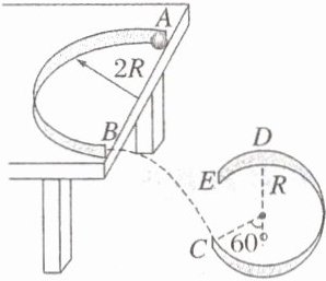 (2023·湖北卷·14)如图为某游戏装置原理示意图。水平桌面上固定一半圆形竖直挡板,其半径为2R、内表面光滑,挡板的两端A、B在桌面边缘,B与半径为R的固定光滑圆弧轨道$\overset{\frown}{CDE}$在同一竖直平面内,过C点的轨道半径与竖直方向的夹角为60°。小物块以某一水平初速度由A点切入挡板内侧,从B点飞出桌面后,在C点沿圆弧切线方向进入轨道$\overset{\frown}{CDE}$内侧,并恰好能到达轨道的最高点D。小物块与桌面之间的动摩擦因数为$\frac{1}{2\pi}$,重力加速度大小为g,忽略空气阻力,小物块可视为质点。求: