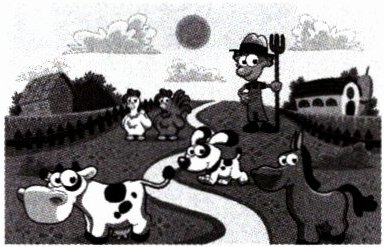 There's** a **cow**, a **horse**, a **sheep** and two **chickens**.