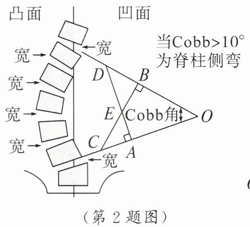 2. Cobb角是一个测量脊柱弯曲角度的方法,其测量结果常用来评估脊柱侧弯的严重程度。某人体检时脊柱的检测示意图如图所示,为方便测出Cobb角(∠O)的大小,需将∠O转化为与它相等的角,则图中与∠O相等的角是(
