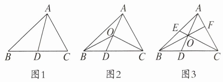 (3)如图3,O是线段AD上一点(不与点A,D重合),连接BO并延长交AC于点F,连接CO并延长交AB于点E. 试猜想$\frac{OD}{AD}+\frac{OE}{CE}+\frac{OF}{BF}$的值,并说明理由.