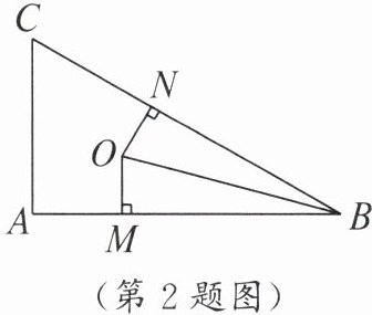 2. 如图,点$O在直角三角形ABC$中,$\angle ABC = 30^{\circ}$,$OM \perp AB于点M$,$ON \perp BC于点N$,若$OM = ON$,则$\angle ABO$为
