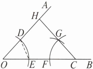 【典型例题 2】如图,已知 $ \angle AOB = \alpha $,点 $ C $ 为射线 $ OB $ 上一点,用尺规按如下步骤作图:(1)以点 $ O $ 为圆心,以任意长为半径作弧,交 $ OA $ 于点 $ D $,交 $ OB $ 于点 $ E $;(2)以点 $ C $ 为圆心,以 $ OD $ 长为半径作弧,交 $ OC $ 于点 $ F $;(3)以点 $ F $ 为圆心,以 $ DE $ 长为半径作弧,交前面的弧于点 $ G $;(4)连接 $ CG $ 并延长交 $ OA $ 于点 $ H $。则 $ \angle AHC $ 的度数为(