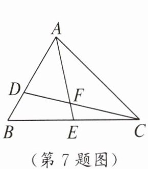 7. 如图,$ AE $ 是 $ \triangle ABC $ 的中线,点 $ D $ 在边 $ AB $ 上,$ AD = 2BD $,$ CD $ 与 $ AE $ 交于点 $ F $,设 $ \triangle ADF $ 的面积为 $ S_1 $,$ \triangle CEF $ 的面积为 $ S_2 $,若 $ S_{\triangle ABC} = 9 $,则 $ S_1 - S_2 = $(