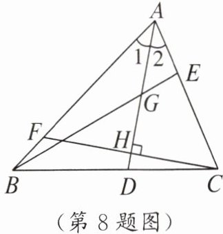 8. 如图,在 $ \triangle ABC $ 中,$ \angle 1 = \angle 2 $,$ G $ 是 $ AD $ 的中点,延长 $ BG $ 交 $ AC $ 于点 $ E $,$ F $ 为 $ AB $ 上一点,$ CF \perp AD $ 交 $ AD $ 于点 $ H $. ① $ AD $ 是 $ \triangle ABE $ 的角平分线;② $ BE $ 是 $ \triangle ABD $ 的边 $ AD $ 上的中线;③ $ CH $ 为 $ \triangle ACD $ 的边 $ AD $ 上的高;④ $ AH $ 是 $ \triangle ACF $ 的角平分线和高线. 上述说法正确的有