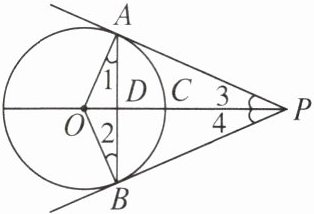5. 如图,从$\odot O外一点P引圆的两条切线PA$,$PB$,切点分别为$A$,$B$,$OP交\overset{\frown}{AB}$,$AB于点C$,$D$. 下列结论:①$PO\perp AB$;②$\angle 3 = \angle 4$;③$\angle 1 = \angle 2$;④$\overset{\frown}{AC} = \overset{\frown}{BC}$;⑤$AD = BD$;⑥$OD = CD$,其中正确的是