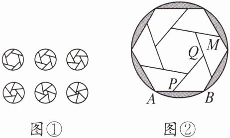 ★11. 小明发现相机快门打开过程中,光圈大小变化如图①所示,于是他绘制了如图②所示的图形。图②中六个形状大小都相同的四边形围成一个圆的内接正六边形和一个小正六边形,若$PQ所在的直线经过点M$,$PB = 5$ cm,小正六边形的面积为$\frac{49\sqrt{3}}{2}$ $cm^{2}$,则该圆的半径为多少?