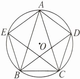 证明 在$\triangle ABC$中,$\because AB=AC,\therefore \angle ABC=\angle ACB.$ 又BD,CE分别平分$\angle ABC,\angle ACB,$ $\therefore \angle ABD=\angle DBC=\angle ACE=\angle ECB.$ $\therefore \overset{\frown}{AD}=\overset{\frown}{CD}=\overset{\frown}{AE}=\overset{\frown}{BE}.$ 又$BE=BC,\therefore \overset{\frown}{BE}=\overset{\frown}{BC},$ 即$\overset{\frown}{AD}=\overset{\frown}{DC}=\overset{\frown}{CB}=\overset{\frown}{BE}=\overset{\frown}{EA}.$ 故点A,E,B,C,D把$\odot O$五等分,即五边形AEBCD是正五边形.