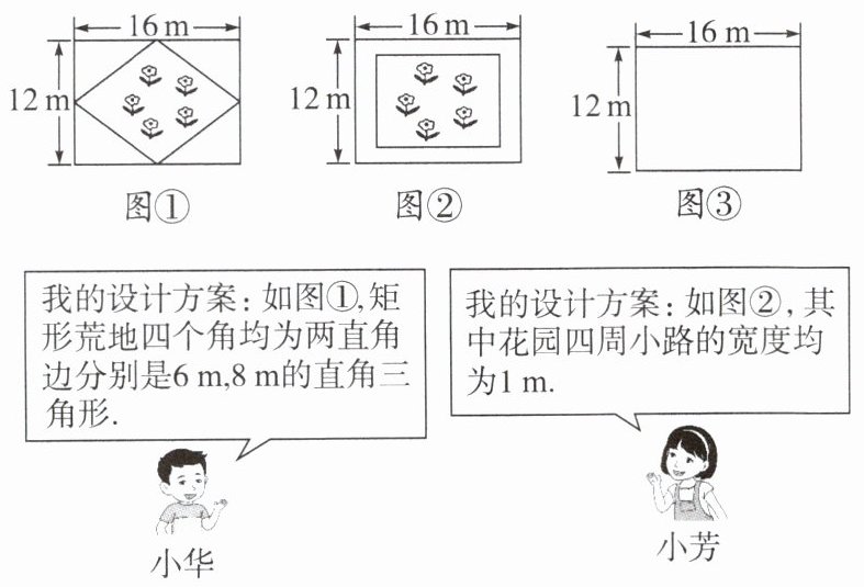 6. 在一块长为 $ 16 \, m $,宽为 $ 12 \, m $ 的矩形荒地上建造一个花园,要求花园面积是荒地面积的一半,下面分别是小华与小芳的设计方案。