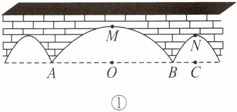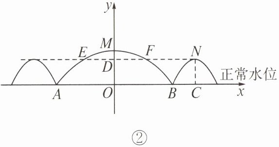 3. 如图①,三孔桥截面的三个孔都呈抛物线形,两小孔形状、大小都相同。正常水位时,大孔水面宽度$AB = 20m$,顶点$M距水面6m(MO = 6m)$,小孔顶点$N距水面4.5m(NC = 4.5m)$。当水位上涨刚好淹没小孔时,借助图②中的直角坐标系,求此时大孔的水面宽度$EF$。