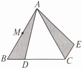 【例】如图,$\triangle ABC$ 是等边三角形,$D$ 是 $BC$ 边上一点,$\triangle ABD$ 经过旋转后到达 $\triangle ACE$ 的位置。