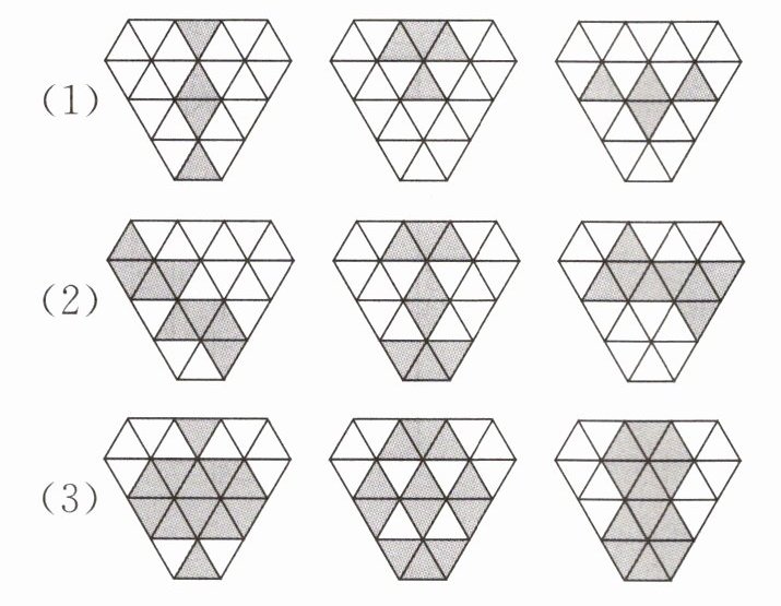【例 2】请你在如图的 3 个网格(两相邻格点的距离均为 1 个单位长度)内,分别设计 1 个图案,要求:在(1)中所设计的图案是面积等于 $ \sqrt{3} $ 的轴对称图形;在(2)中所设计的图案是面积等于 $ 2\sqrt{3} $ 的中心对称图形;在(3)中所设计的图案既是轴对称图形又是中心对称图形,并且面积等于 $ 3\sqrt{3} $。将你设计的图案用铅笔涂黑。