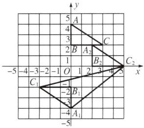 (2)如图,$\triangle A_2B_2C_2$即为所求.$\triangle A_1C_1C_2$的面积$=4× 8-\frac{1}{2}× 3× 2-\frac{1}{2}× 2× 8-\frac{1}{2}× 4× 5=11$.