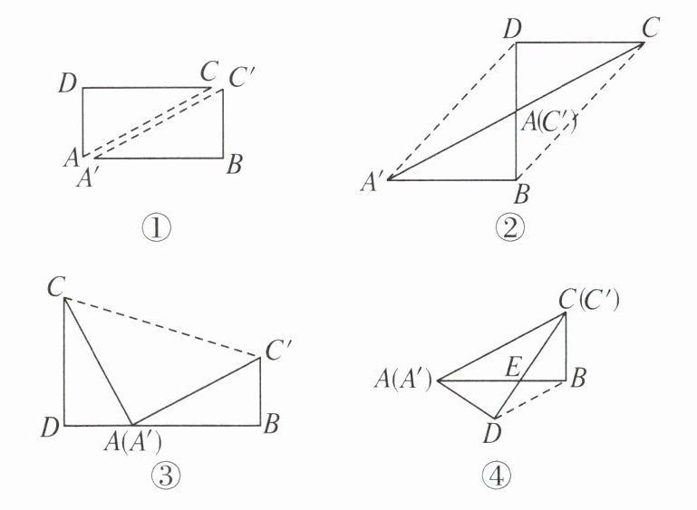 15. 如图①,有一张矩形纸片,将它沿对角线 $ AC $ 剪开,得到 $ \triangle ACD $ 和 $ \triangle A'BC' $。