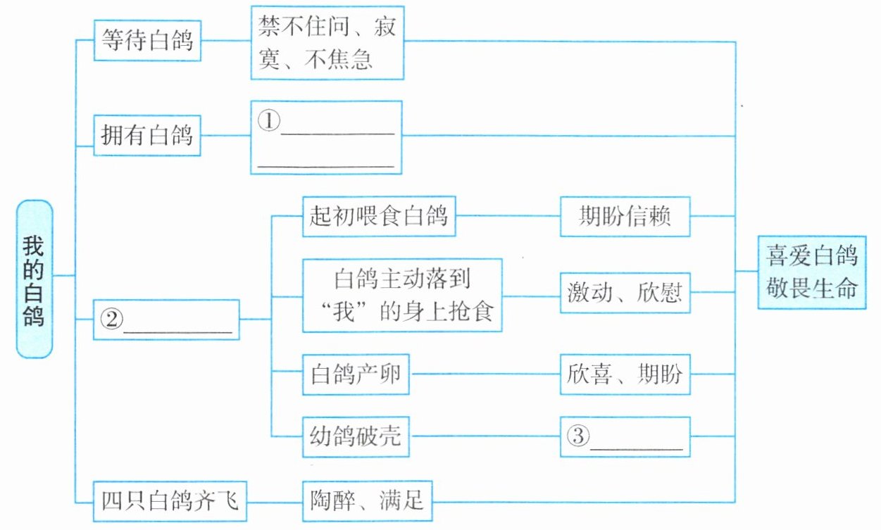 ①欣喜、惊讶 ②与白鸽相处 ③期盼蜕变、成长