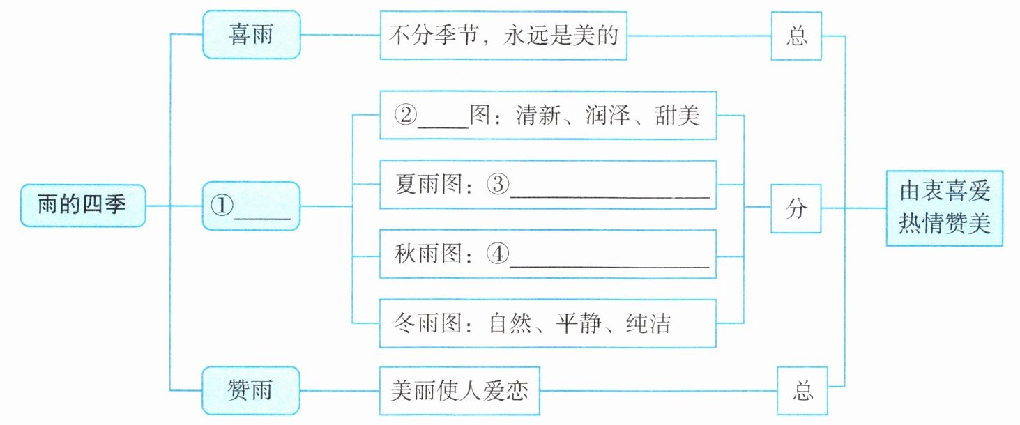 雨的四季 ①____ $\begin{cases}喜雨——不分季节,永远是美的\longrightarrow总\\②$______$图:清新、润泽、甜美\\夏雨图:③$______$\longrightarrow分\longrightarrow由衷喜爱热情赞美\\秋雨图:④$______$\\冬雨图:自然、平静、纯洁\end{cases} $总