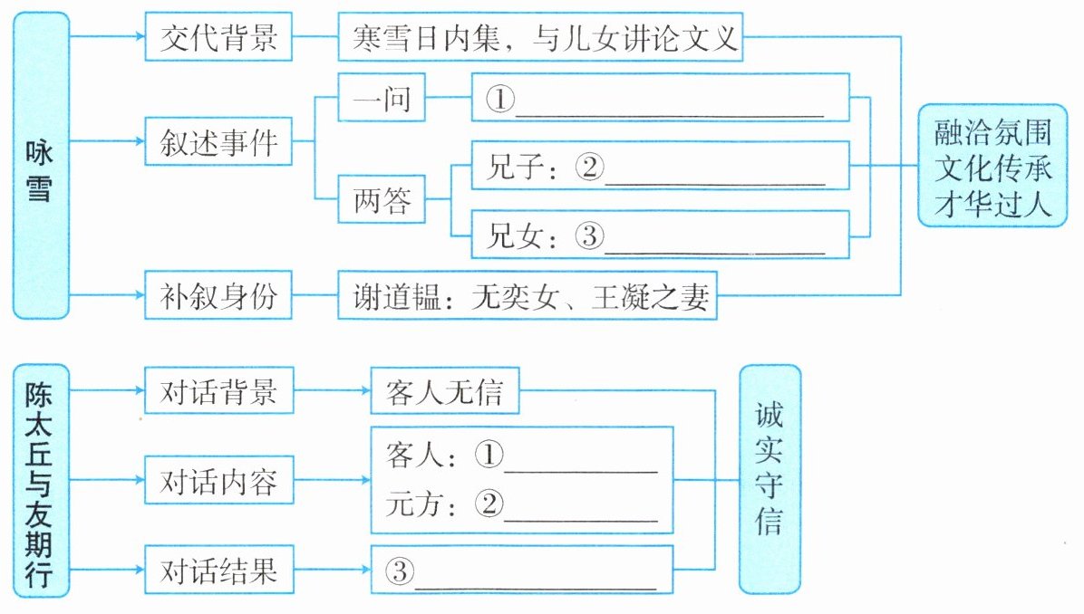 《咏雪》:①白雪纷纷何所似 ②撒盐空中③柳絮因风起《陈太丘与友期行》:①对子骂父 ②据理抗辩③客人认错