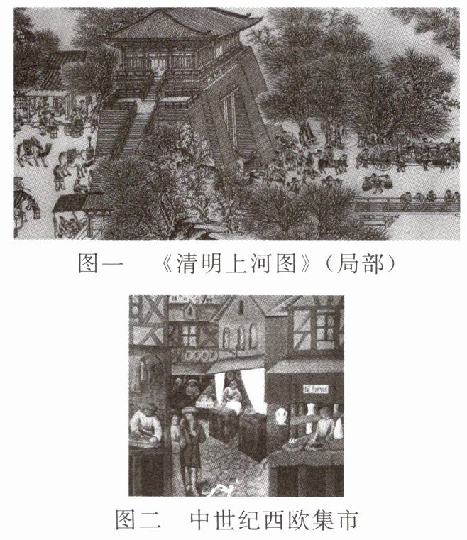 (1)图一、图二两幅中外美术作品生动地展现了人类社会哪一历史阶段城市发展的风貌?突出反映了古代城市的发展与哪些经济活动密切相关?