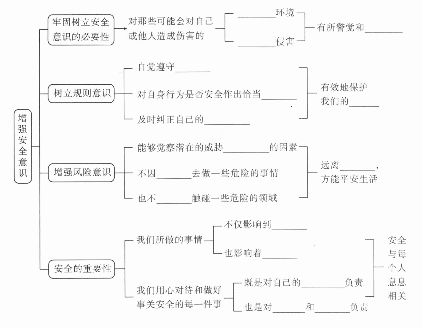 安全的重要性:我们所做的事情不仅影响到______,也影响着______;我们用心对待和做好事关安全的每一件事,既是对自己的______负责,也是对______和______负责,安全与每个人息息相关
