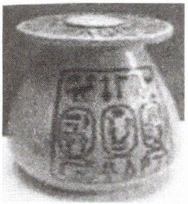 6. 下图的石瓶是古埃及阿蒙荷特普三世王后提伊的物品,用于盛化妆品或油膏,瓶身上有王后和国王的名字,写在椭圆形的圈框里。石瓶上的文字应该是(