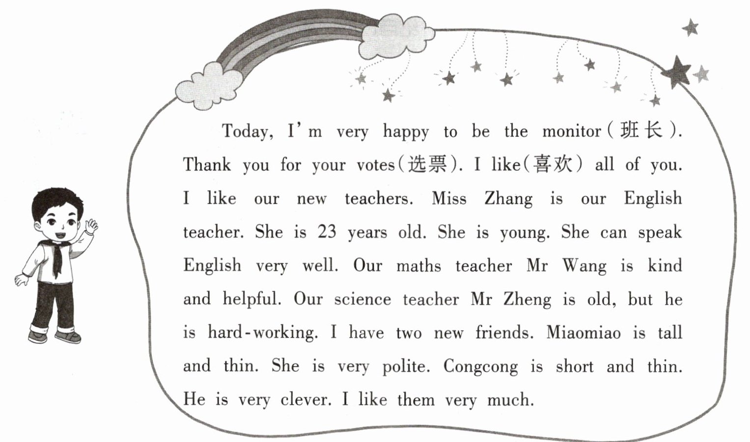 四、Think and say. 你所在的班级有哪些优秀的班干部呢?他们是什么样的人呢?请你想一想,跟小伙伴说一说吧。