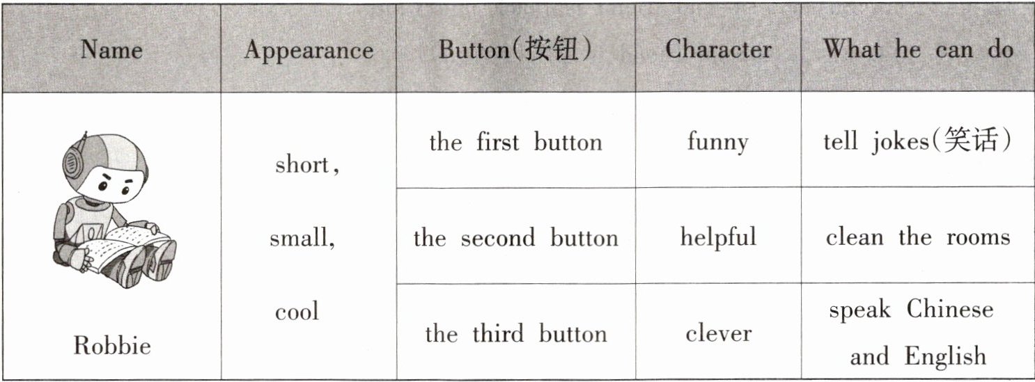 二、Look and answer. Sally有一个智能机器人朋友。她为这个特殊的朋友制作了一张表格。请你看一看,回答下列问题。
