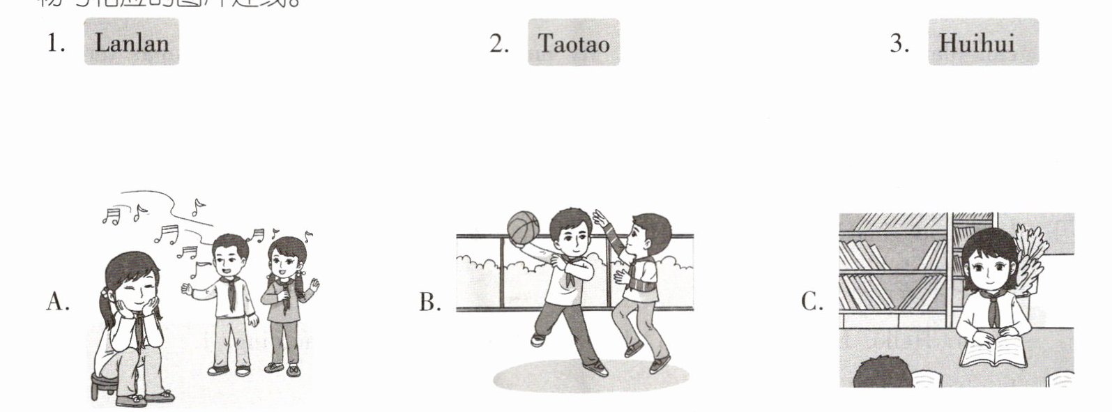 一、Listen and match. 放学后,同学们积极参加丰富多彩的社团活动。请你听一听,将人物与相应的图片连线。