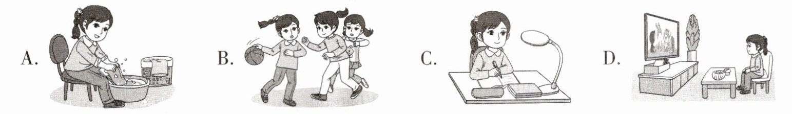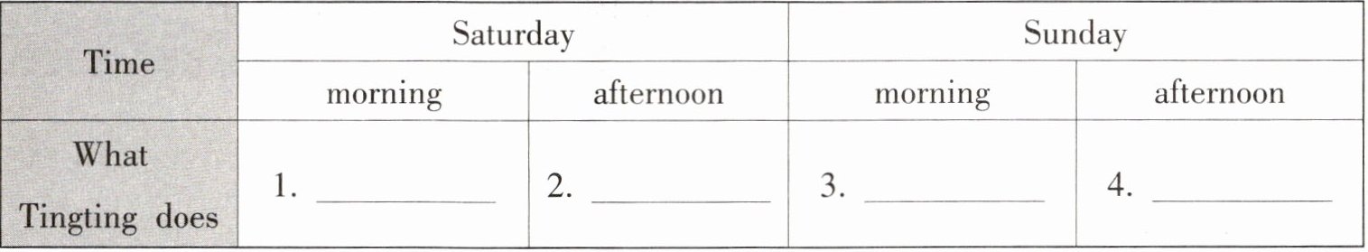 二、Listen, choose and fill in the table. Tingting正在介绍她的周末活动。请你听一听,根据所听内容,选择相应的图片完成表格。(填序号)