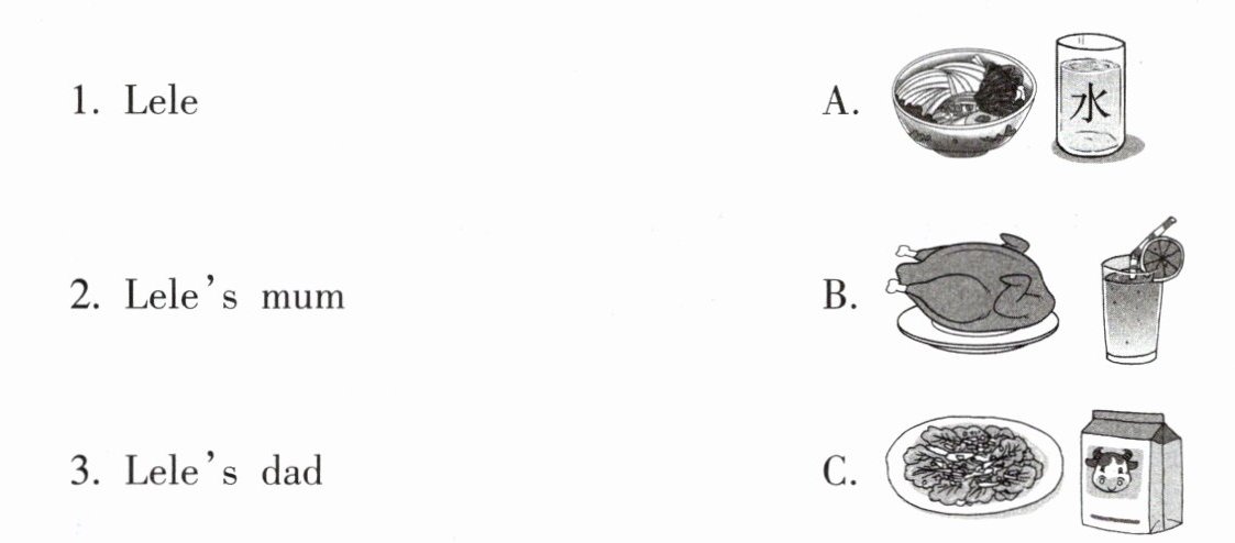 三、Read and match. Lele一家来到月亮餐厅吃晚餐。他们想吃点什么、喝点什么呢?请你读一读,根据对话内容将人物和相应的图片连线。