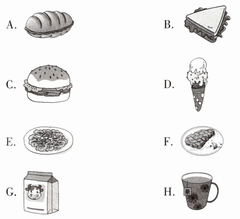 一、Listen and choose. 午餐时间到了。Linda和朋友们来到了学校餐厅。他们分别介绍了自己喜欢的食物或饮品。请你听一听,根据所听内容,选择相应的图片。