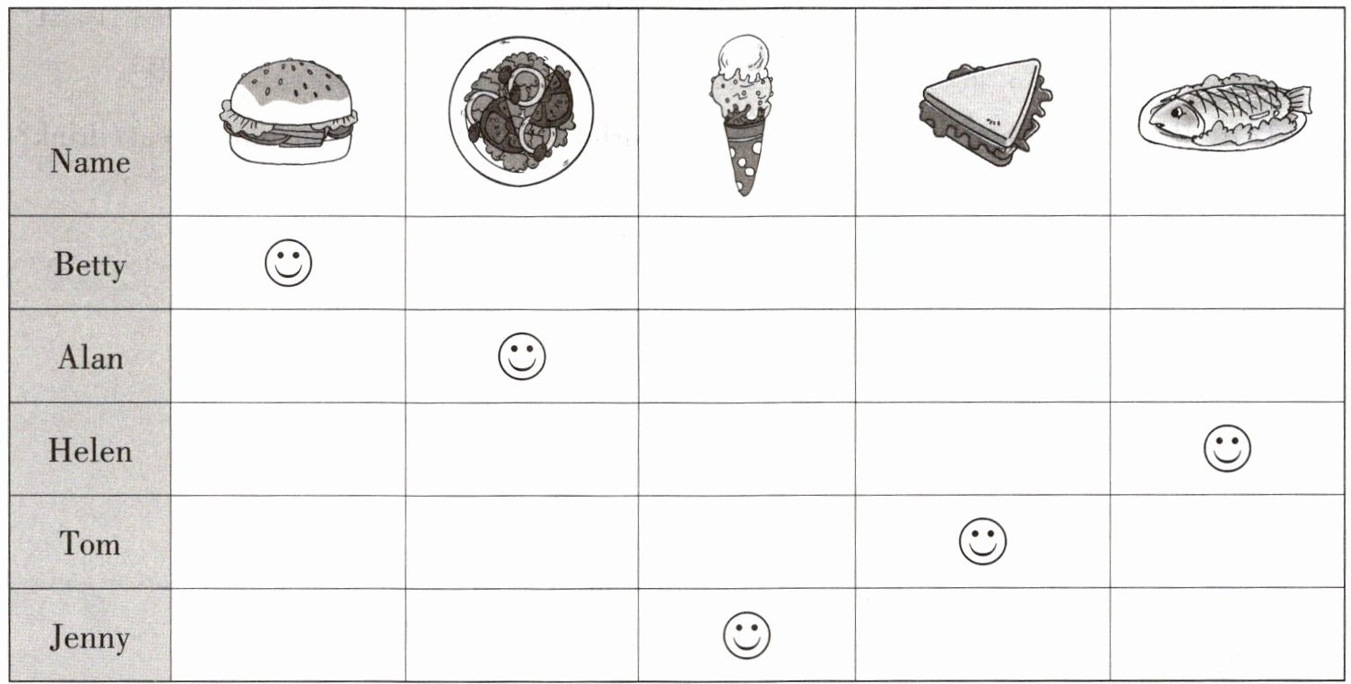 二、Look and fill in the blanks. Lucy对自己朋友们喜欢的食物进行了调查,并制成了下面的表格。请你看一看,根据表格内容补全句子。